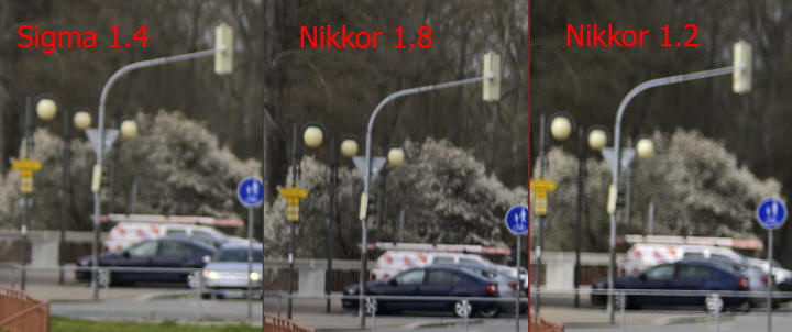 Je evidentní, že neostré pozadí se objektivu daří vykreslovat lépe, než neostré popředí. Někdy se tam mohou objevit i na nízké clonové číslo ostřejší náznaky "kočičích očí": A jak je na tom vzdálené popředí? U neostrého vzdáleného popředí dochází (zde na clonovém čísle 1.2) k deformaci bokehu a z kočičích očí se stávají malé vlaštovičky - ale to co vidíte na výřezu, pochází z tiskové velikosti cca 120 x 180 cm, jinak nemáte šanci je vidět. Ale to, co budete mít šanci vidět, je neostré vzdálené pozadí v případě reflexních bodových ploch - body nedostanou typickou strukturu "cibulových kroužků", nýbrž jakéhosi "mramorování": U snímků v noci je struktura neostrých bodových světelných zdrojů daleko méně patrná: Zajímavé je i porovnání charakteru bokehu všech tří objektivů na nejnižších clonových číslech: Kliknutím na obrázek si můžete zobrazit velikost 1:1. Sigma má asi největší aberaci, ale její zobrazení neostrého pozadí je ze všech tří pro mne nejpříjemnější, byť je tam trochu úbytek kontrastu. Nikkor 1.8 již má snahu mírně obtahovat neostré části linkou a Nikkor 1.2 k tomu přidává ještě mírné zdvojení obrysů. Z následující tabulky si můžete stáhnout porovnávací snímky v plném rozlišení, zaostřeno je na válcovitý reklamní poutač na pravé straně: